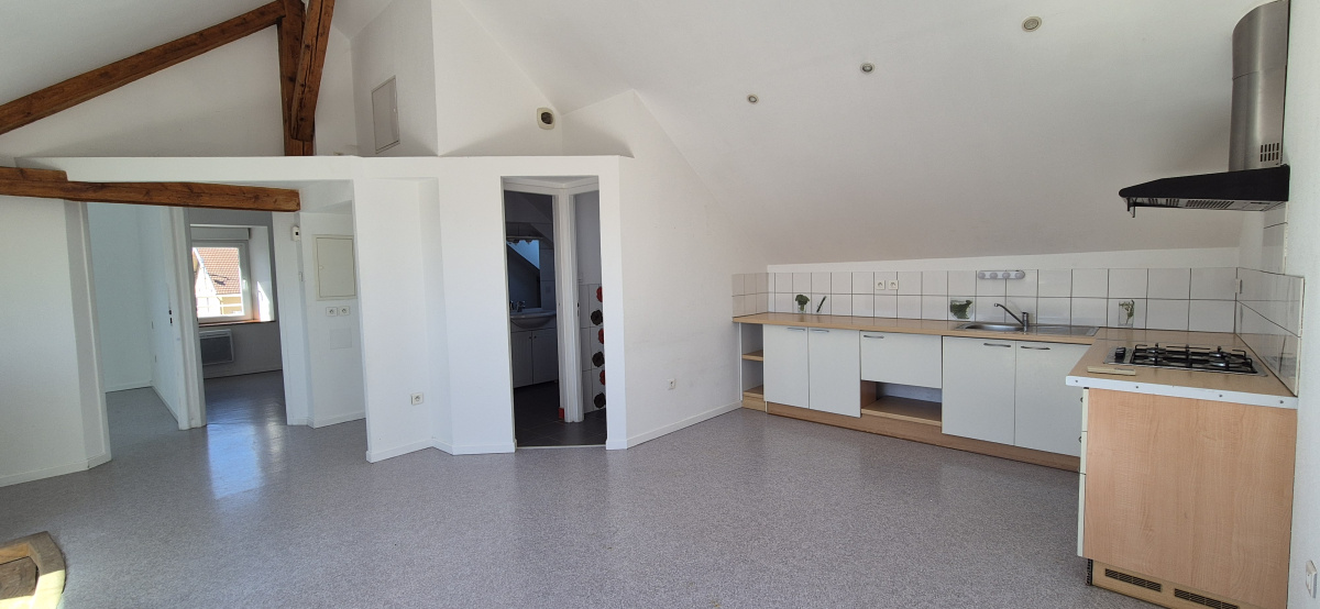 Mandeure, au dernier étage d'une maison, venez découvrir ce T3 atypique comprenant : cuisine équipée ouverte sur séjour très luminuex avec terrasse plein sud, salle de bain, WC, 2 chambres.